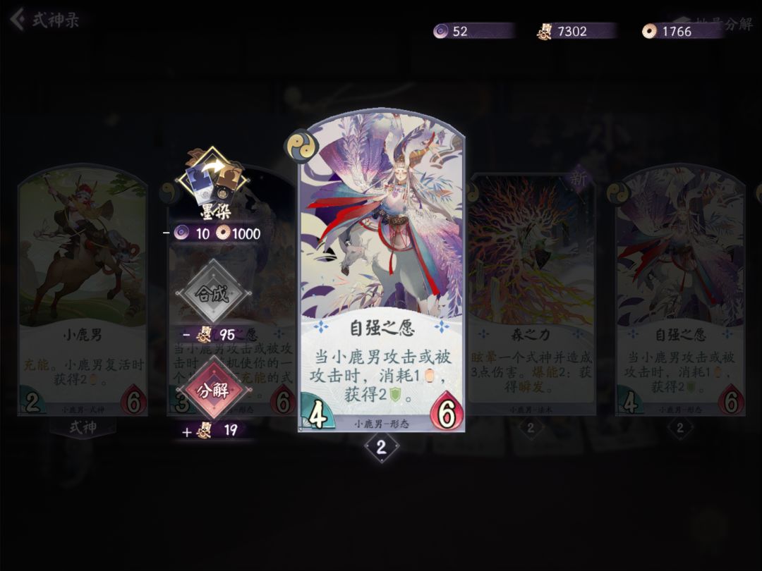 ④鹿角冲撞: 小鹿男的ssr我排T2,因为小鹿男的攻击很低,即使带上形态也才4攻,但是这张牌可以最高加5攻击和连击,也就是哪怕裸身材2攻小鹿男也能打出14点的伤害,就算不拿来斩杀也能配合卡牌的免疫战斗伤害,连击来占场。