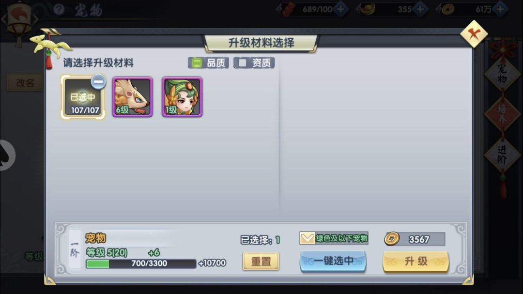 升级宠物的主要材料是经验丹和低级宠物,宠物经验丹可以由天书世界中产出,而低级宠物则主要依靠大家捕捉。所以,快把手中的低级捕捉令利用起来吧!白色、绿色、蓝色品质的宠物可都是主力宠物的重要口粮呢!
