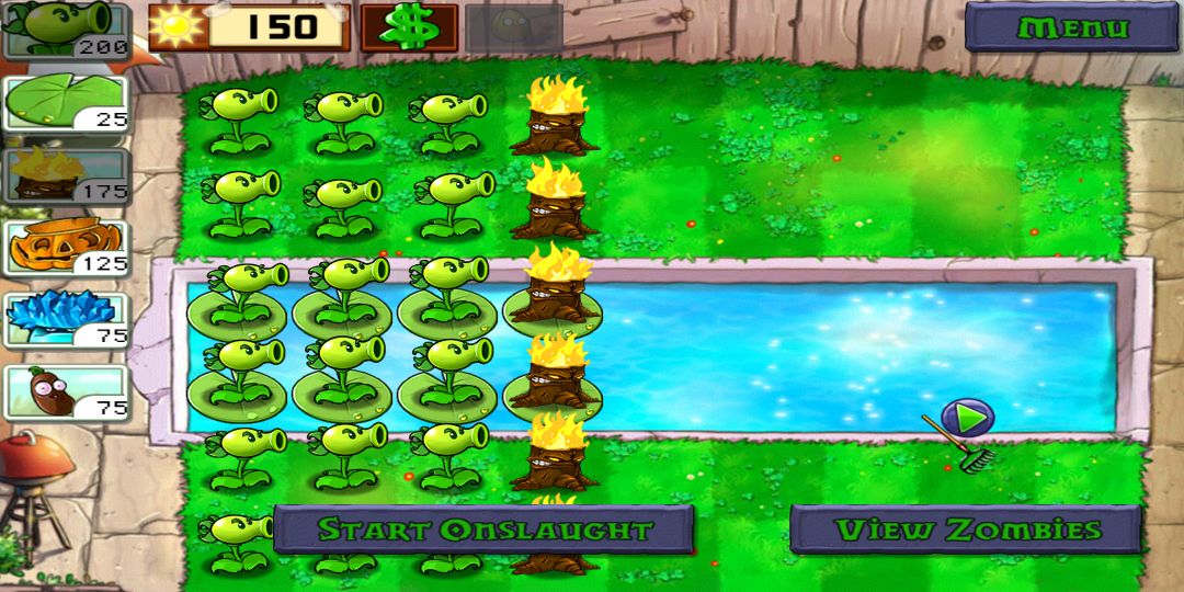 后边四个大蒜也可更换为空的南瓜套,作用都是抵挡僵尸不让其前进,用忧郁菇来打僵尸。(还有,不要吝啬锤子!)同扶梯僵尸过去的可能会有小丑僵尸,卡槽多的可以带倭瓜,和食人花来消灭。