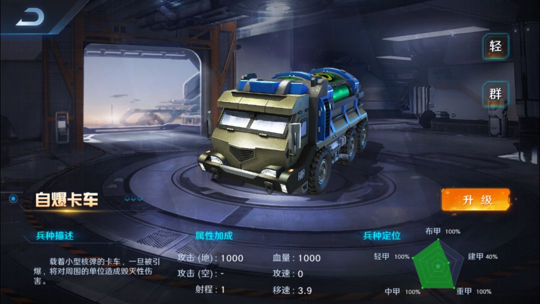 自爆卡车属于辅助类兵种,可以辅助地面坦克类兵种,如天启、灰熊、幻影等坦克,如果敌方出大量磁暴步兵或美国大兵,会克制天启、灰熊、幻影等坦克,此时配合自爆卡车,可炸毁一大片磁暴步兵或美国大兵,起到很好保护地面坦克类兵种进攻。