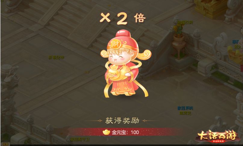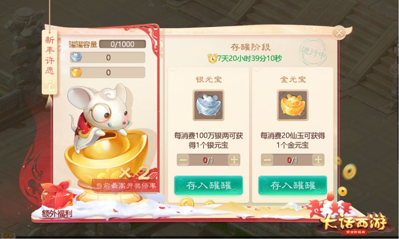 除了玉帝之外,财神爷也给三界侠士们送来意想不到的惊喜。玩家参与“新年许愿”活动,在除夕前向财神的罐中存入金银元宝,在春节后即有机会收获多倍福利!