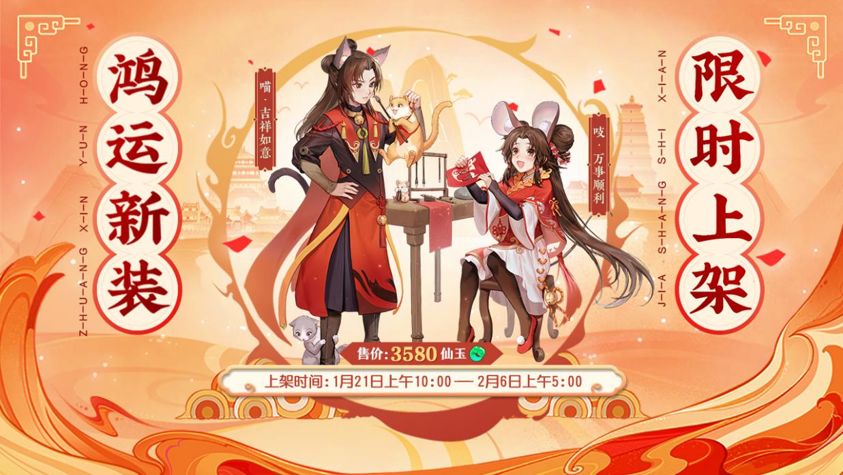 除此以外,全新鼠年新装也将正式上架,1月21日-2月6日期间,2020新春时装限时出售,萌趣猫鼠主题的开运新装,换上它定能让侠士们容光焕发,在新的一年里好运连连!新时装售价3580仙玉,喜欢的侠士们请尽早下手,不要错过购买时机哦!
