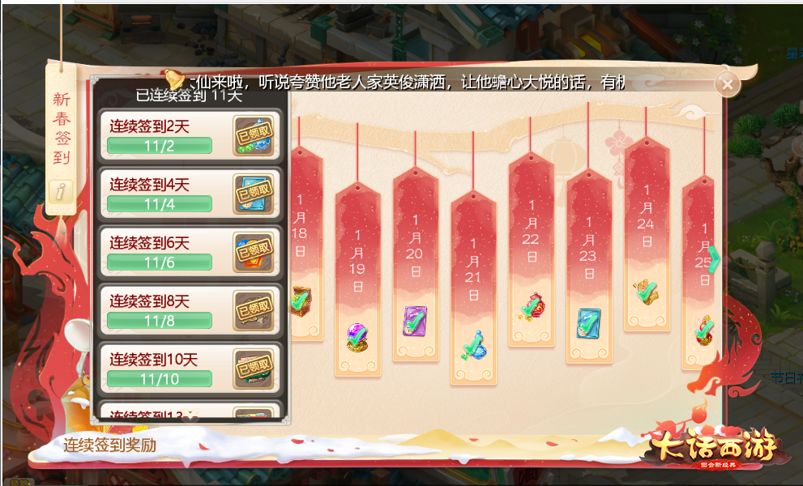 欢度新春,福气降临,大话手游早已准备好了满满的新春好礼送给侠士们,让大家在正月里每一天都能满载而归!1月16日(廿二)-2月8日(十五)期间,玩家每日登陆游戏签到就能获取当日好礼,同时还可预知第二天签到能获得的奖励。连续签到达到相应的日期更有额外奖励可以领取,连续签到时间越长,能获得的奖励越棒哦!奖励不仅包括大量游戏道具和实物奖励,更有免费机票,快来签到试试自己的运气吧!