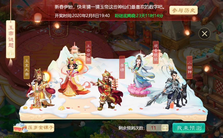 1月16日-2月8日19:00之前玩家可以参与“玉帝谜题”活动,竞猜神仙们喜欢的数字。在2月8日19:40,玉帝将会揭晓谜底,猜中神仙喜欢的数字的玩家,将按各个奖项瓜分玉帝为大家准备的新年压岁钱!
