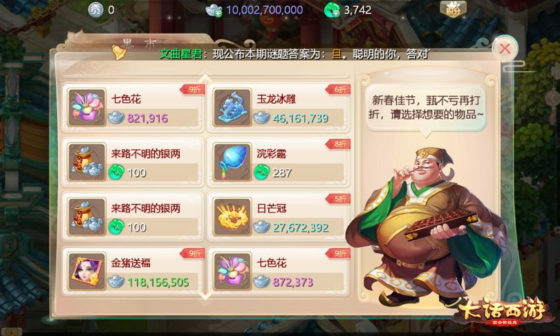 财运双全,衣锦还乡,在新春佳节里,除了趣味十足的活动玩法,大话手游同样为侠士们准备了琳琅满目的年货和超值商品,等待大家前来选购!
