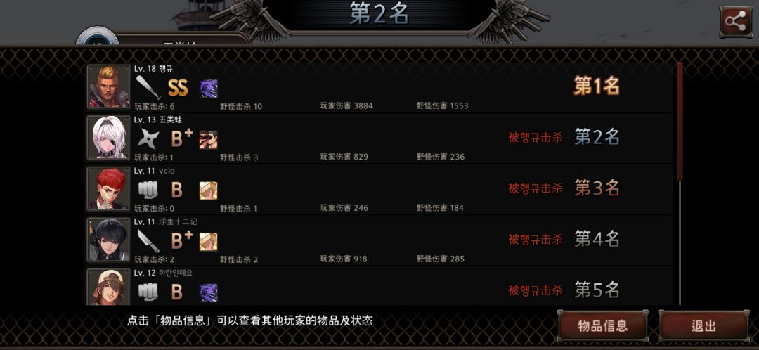 手机端玩家,遇到一个带加速,确无限追着人打的玩家(下图第一名)。不清楚是挂还是pc端的。该玩家从头杀到尾,在我们还在搜物资时,他就在打人,到我遇到他时已经无法打了。