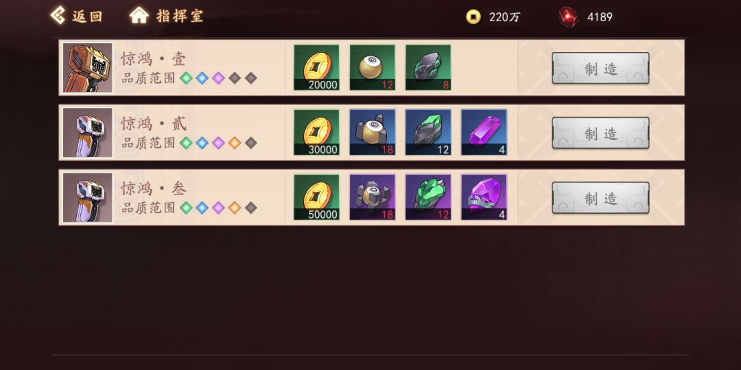 其中,机关臂和头甲,胸甲,手甲,腿甲均由玩家自行制造。机关臂可以直接制造,只需要等级足够。而头甲,胸甲,手甲,腿甲除了等级要求,还需要把铸造坊提升到相应等级哦,而玉佩(近战职业与远程相反,这里是近战,后同)需要从关卡中获得,护符则需要从会战玩法中兑换。。。
