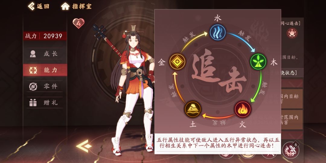主动技能装配属性核心或木甲的攻击,击中敌人会造成当前属性异常状态,相生图下一属性的木甲小姐姐就可以发出同心连接技能了。。。(例如我们给速攻装上木属性的核心,在用它攻击敌人,敌人会被带上木属性负面buff,这时候具有它相生的属性【火】属性的木甲就可以释放同心连击了)注意:木甲同心连击有冷却时间。