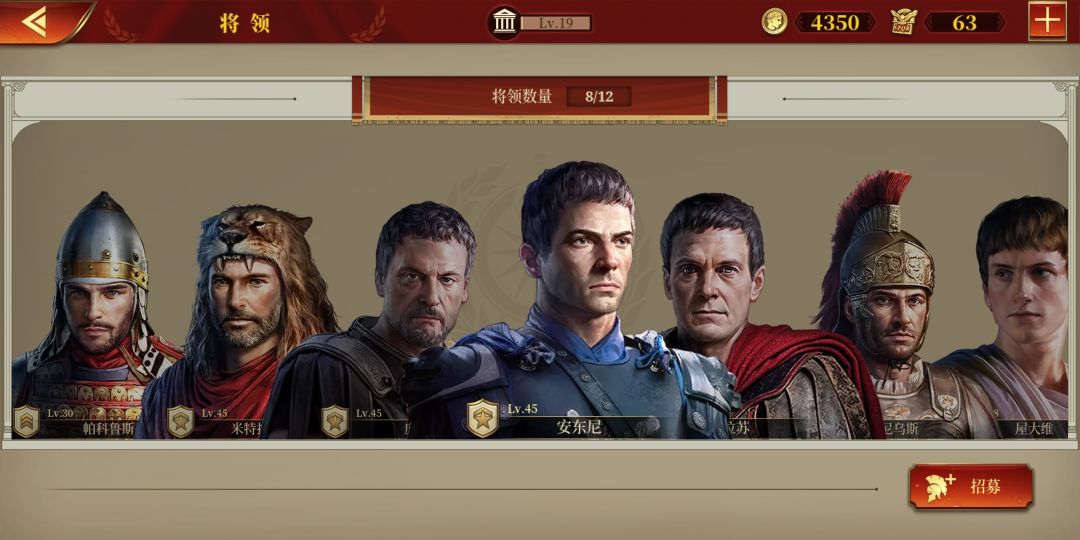 萌新推荐入手将领:帕神(可用到后期)、庞培、特雷波尼乌斯(过渡)、米特拉达梯、德鲁苏斯、安东尼、霍去病、维钦托利
