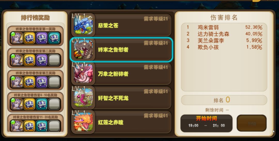 每天19点到21点会开放世界Boss。世界Boss是所有玩家共同合作挑战一个Boss的关卡。根据每个玩家对Boss造成的伤害,会进行排名。最后系统会统计排名,自动发送对应的奖励礼包。世界Boss的奖励非常丰厚,并且只要参加就能领取奖励,十分值得参加。