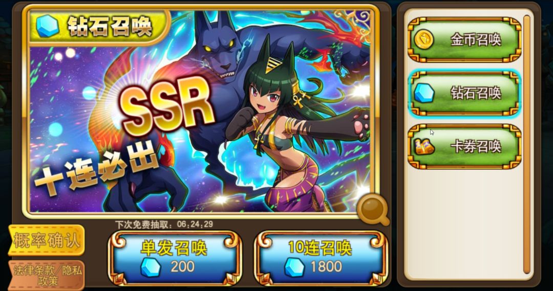 召唤宠物天天萌宠的召唤系统非常良心。钻石抽卡,每12小时,可以免费抽取一次。这样就算是平民玩家也可以有很大的机会,收集到稀有的宠物了。十连召唤钻石消耗打九折,更加重要的有是保底,必定会出SSR宠物哦。