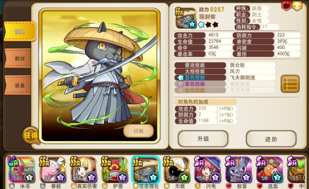 《天天萌宠》中宠物进阶的成长幅度非常巨大,效果明显。玩家经常会遇到原本无法战胜的关卡,进阶后就能轻松获胜的情况。进阶顺序是白星=>绿星=>蓝星=>紫星=>金星。进阶不只是在属性上有大幅度的增加。宠物在进阶到蓝星、紫星、金星阶段时,还能够获得新的宠物技能。从而起到质的变化。宠物等级不能超过角色等级,进阶则不受等级限制