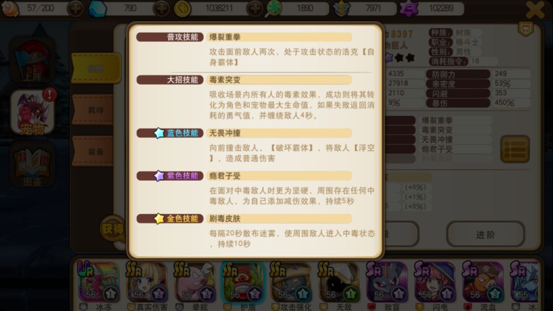 进阶需要的主要材料是宠物基因。宠物基因在战场关卡中够获得。稀有度越高的宠物,在关卡中获得宠物基因将越晚。所以前期推荐练一些SR宠物,而不是一味SSR宠物,如何最快最有效培养宠物,也是游戏中最主要的乐趣。