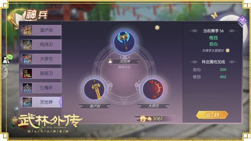 修为是少侠的专属属性,在PVP活动中生效,如武状元、荒林竞技场、毒海鏖战等。少侠对神兵的培育将同时提升战力与修为。新赛季主题属性为格挡&会心,神兵灭世斧在增强修为的同时,也将为少侠带来150点格挡与会心的增益。