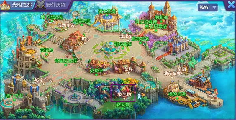 打开主城光明之都的全景地图,在地图的中下部分,我们可以找到醒目的“染色坊”标志,点击“染色坊”,光明之都的狮鹫车夫将会把我们送到染色师梅拉夫人处,与梅拉夫人兑换,即可进入染色坊。