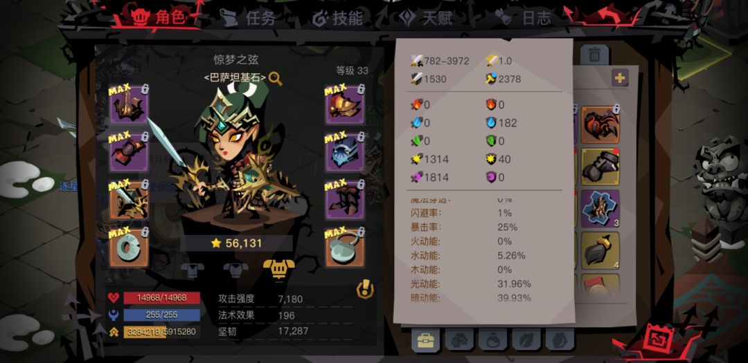 属性如图,肩膀没光,项链3爆暗攻,全身三孔都是光暗暴击符文。做日常顺手练练二阶段反击。
