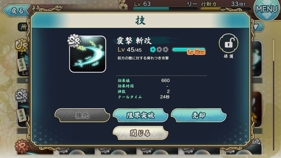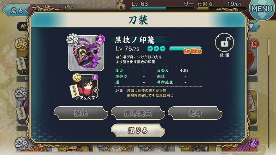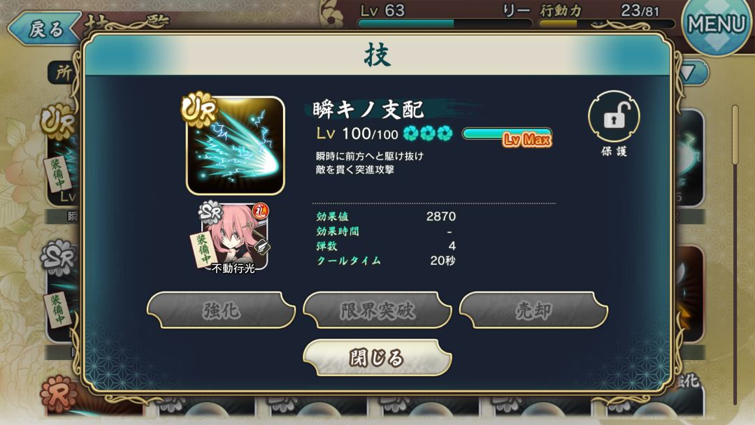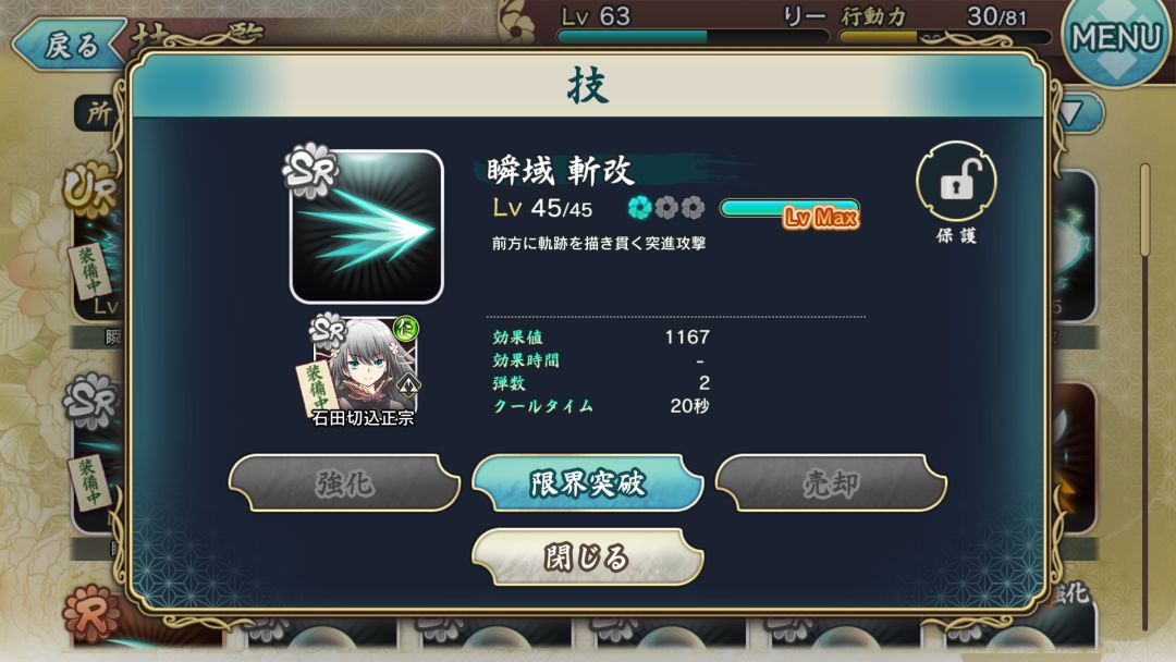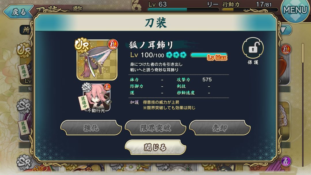 第一次活动的兑换装备,加护是提升闪避时的移动距离,满破664攻击,目前来说没什么大用,或许以后会用到。
