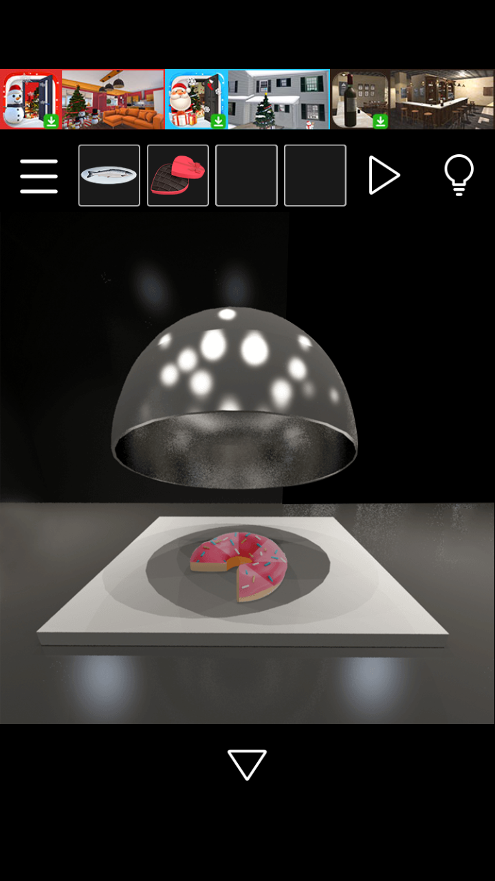 回有玻璃门的房间,用鱼引出小猫(不得不槽一句明明门锁着猫却能出来怕是会穿墙术)得到钥匙开门,左边桌子上拿到第五个硬币,用五个硬币从贩卖机得到牛奶,回厨房依次将牛奶,可可粉倒进锅里煮,倒进模具做好巧克力,装盒