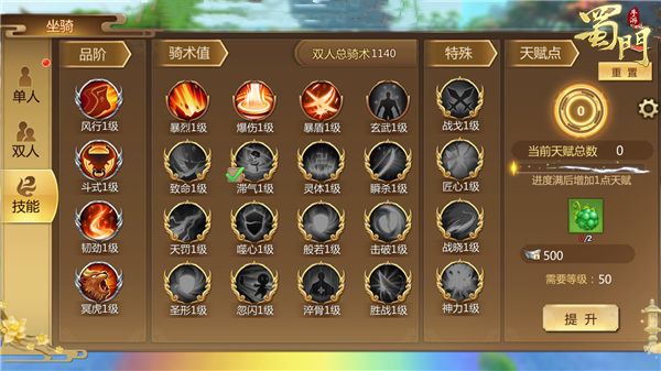 随着版本的更新,双人坐骑也增加了全新的技能。当双人总骑术值达到24000时,可解锁新双人坐骑技能【淬骨】,能提升玩家的真实伤害与生命值的属性;当双人总骑术值达到26000时,可解锁新双人坐骑技能【胜战】,能提升玩家的真实伤害与攻击力的属性,而双人坐骑的天赋点上限也由120提升至140点。