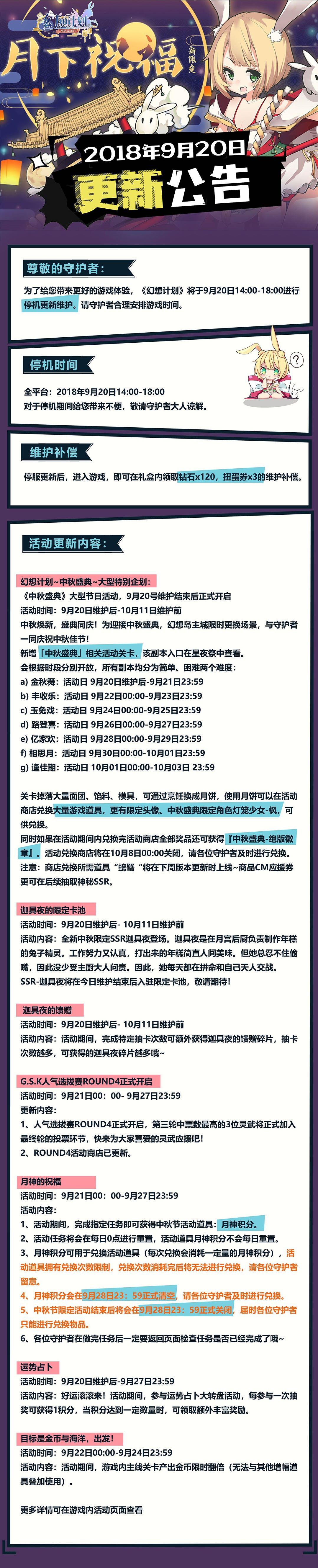 为了给您带来更好的游戏体验,《幻想计划》将于9月20日14:00-18:00进行停机更新维护,请守护者合理安排游戏时间。
