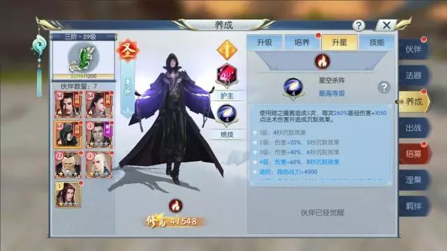 绝技-星空杀阵:使用暗之魔套造成多次法术伤害,并附带沉默效果,技能等级越高沉默时间越长! 除了高额伤害外,绝技的亮点在于强力的控制效果,长时间沉默能够令对手丧失还击之力,道友则可以趁机造成巨额输出!