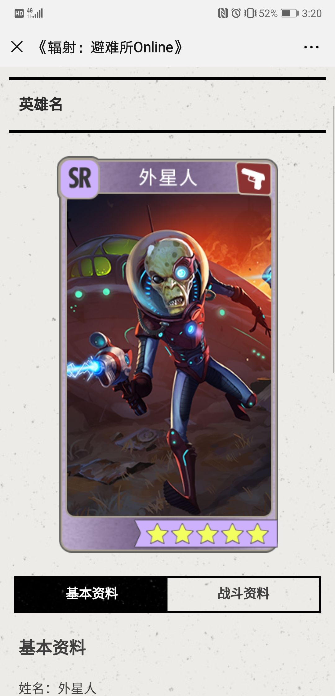 外星人是一位靠着平A输出的英雄,比较吃星级与等级提升带来的属性,被动的吸血和暴击值与大招的属性提升(攻击力,暴击)可以让五星的外星人A一下四五万的伤害,并且一枪可以给自己回两三千的血量让自己更加站的住脚,外星人在团队废土幸存者之中也是不可缺少的主力输出(壮壮,局里,尼克,外星人,派普),整个团队的血量加成让外星人不仅输出高也够肉。
