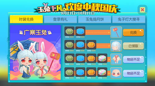 但愿人长久,千里共婵娟。这两套美丽的时装就是玉兔带给大家的礼物啦,9月21日-10月11日期间,只要收集指定数量的月饼就可以兑换了,时间有限,请尽早兑换哦!