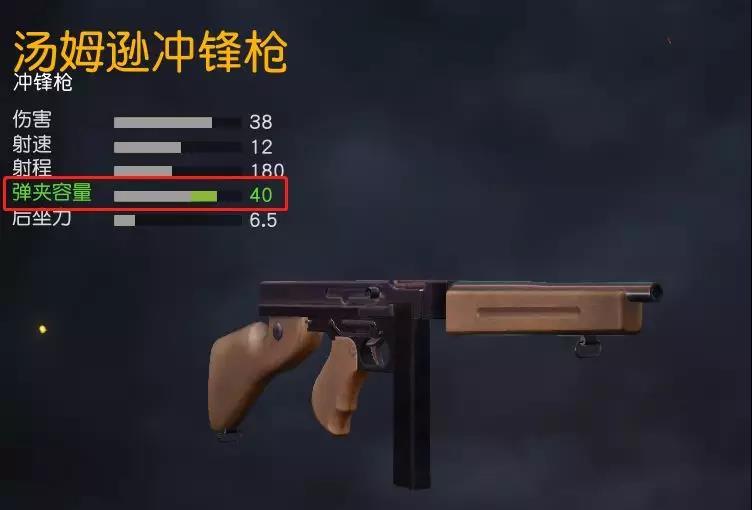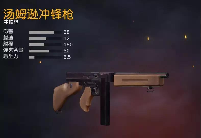 通过上图我们可以看到,汤姆逊冲锋枪单发伤害38点,射速12,射程180,弹夹容量30,后坐力6.5。
