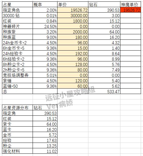 占星部分为计算所有概率及单价后单次的相对价值,