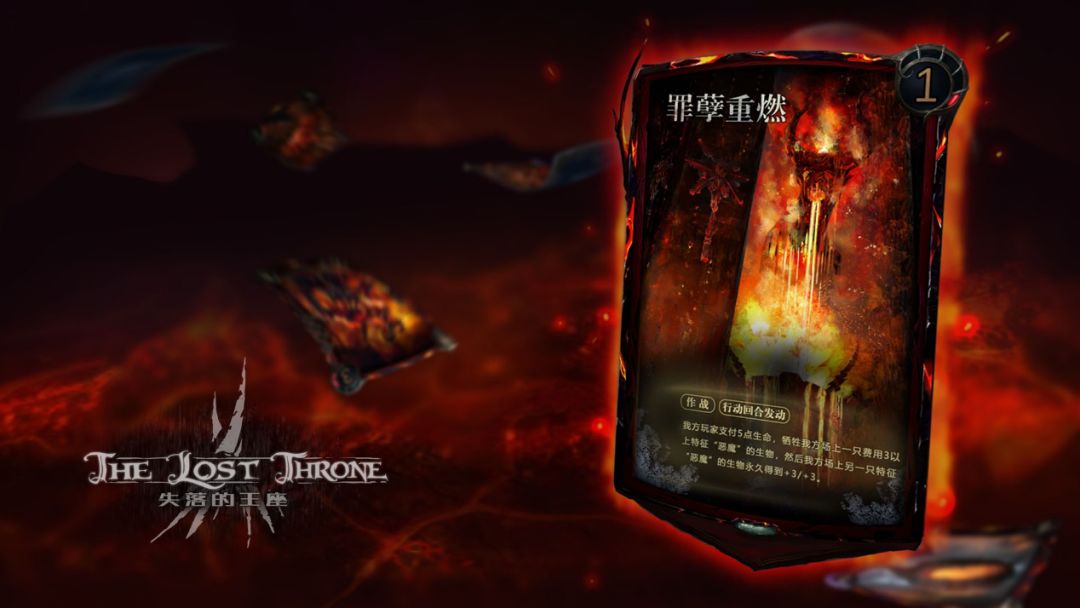 罪孽重燃需要是一张1费用1荒邪科技的作战卡。它的效果使得玩家扣除5点生命值并牺牲场上一只费用3以上的恶魔从而使得另一只恶魔生物永久获得+3/+3。罪孽重燃效果发动的同时代价也相对较大,但是一费用的灵活性使得玩家可以进行巧妙地战斗策略。