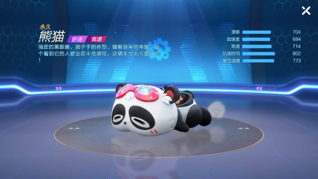 熊猫赛车,史诗品质,性能中等,是玩家进入游戏后除了商城购买外能获得的最好的赛车之一,外观Q萌,男女通吃哈,当然,重点是永久哈!