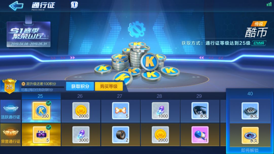 两种通行证会有两种后续,活跃通行证,获得后不会获得特别的东西,只是需要玩家完成每日任务来给通行证升级,从一级开始,奖励各种游戏币、升级资源、皮肤等,奖励中规中矩,虽然除了最终奖励的爆裂赛车外没有太多亮点,不过作为免费的福利来说还是很不错的哟。