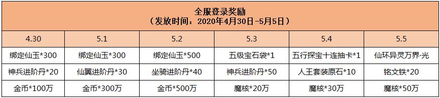 五日在线狂欢,在活动期间登录游戏,即可领取金币、绑玉、进阶丹,还有五行探宝十连抽卡、仙环异灵万界·光等珍稀道具送哦!