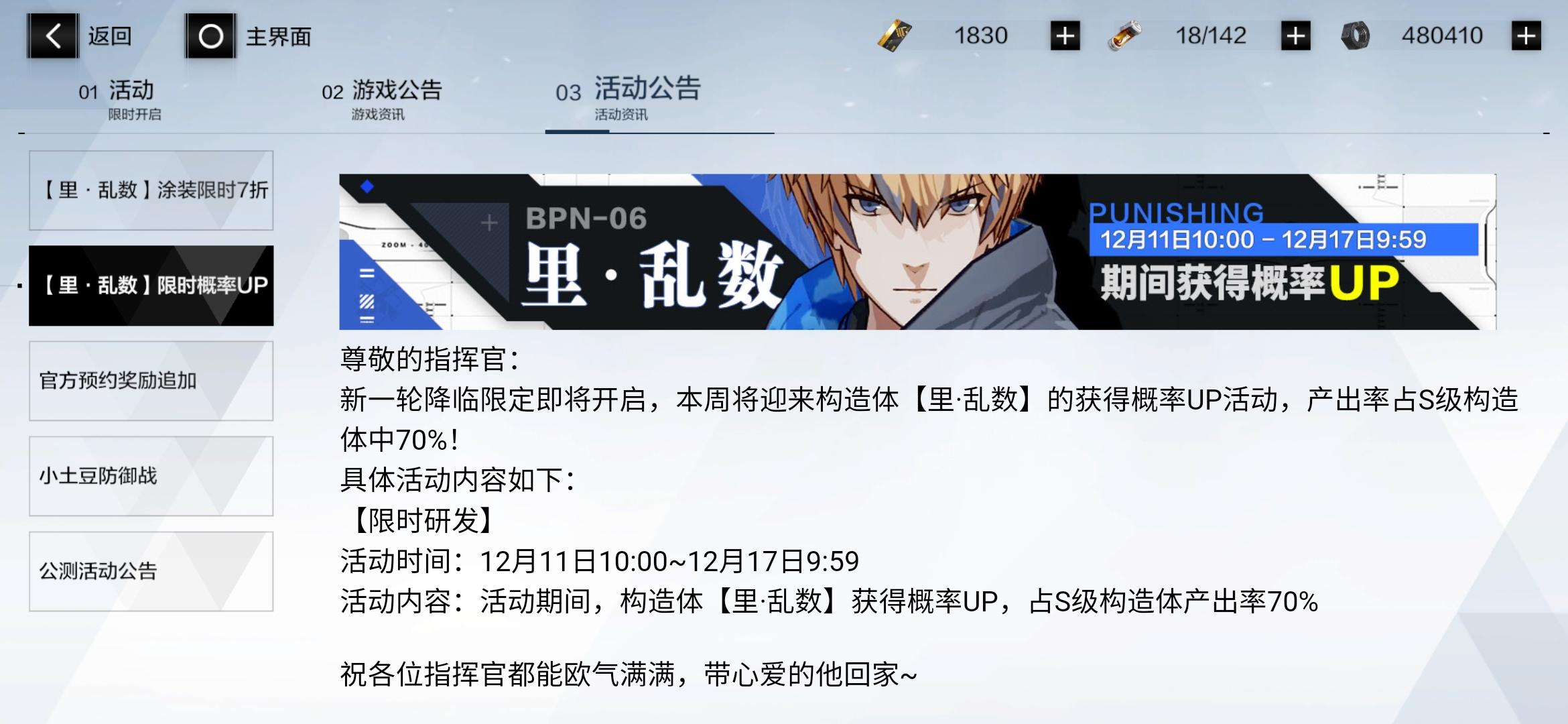 看到官方公告,下一个概率up角色是乱数,从11号到17号期间概率上升。