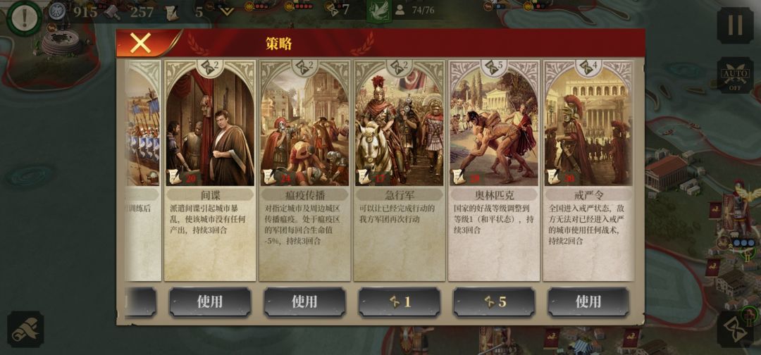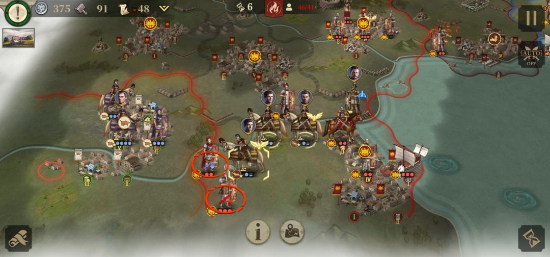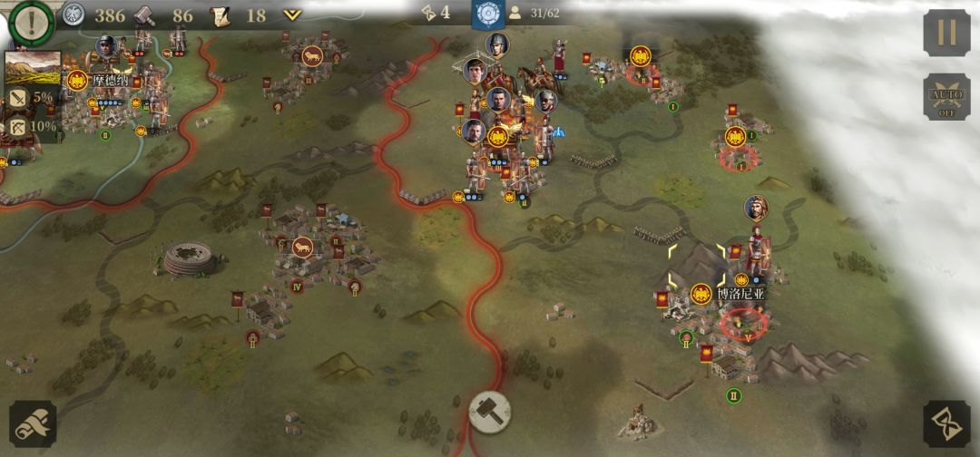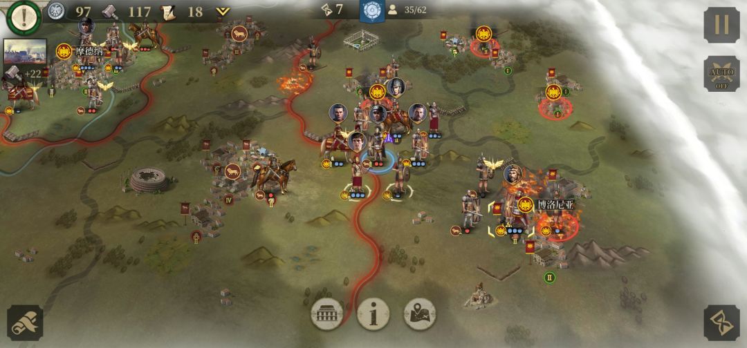 3.第三回合将获得屋大维控制权,利用强行军使屋大维到达图中所处位置获得两座红圈城市控制权
