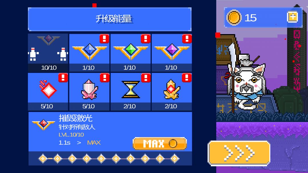 2激光喵:不要用打造喵喵,打造出来的是使用品退出游戏再进就没有了,推荐前期买2个绿色喵喵来回换着用,只要体力够就行,到90关以后攒钱买24000的橙色喵喵对打钱通关都有很大帮助!