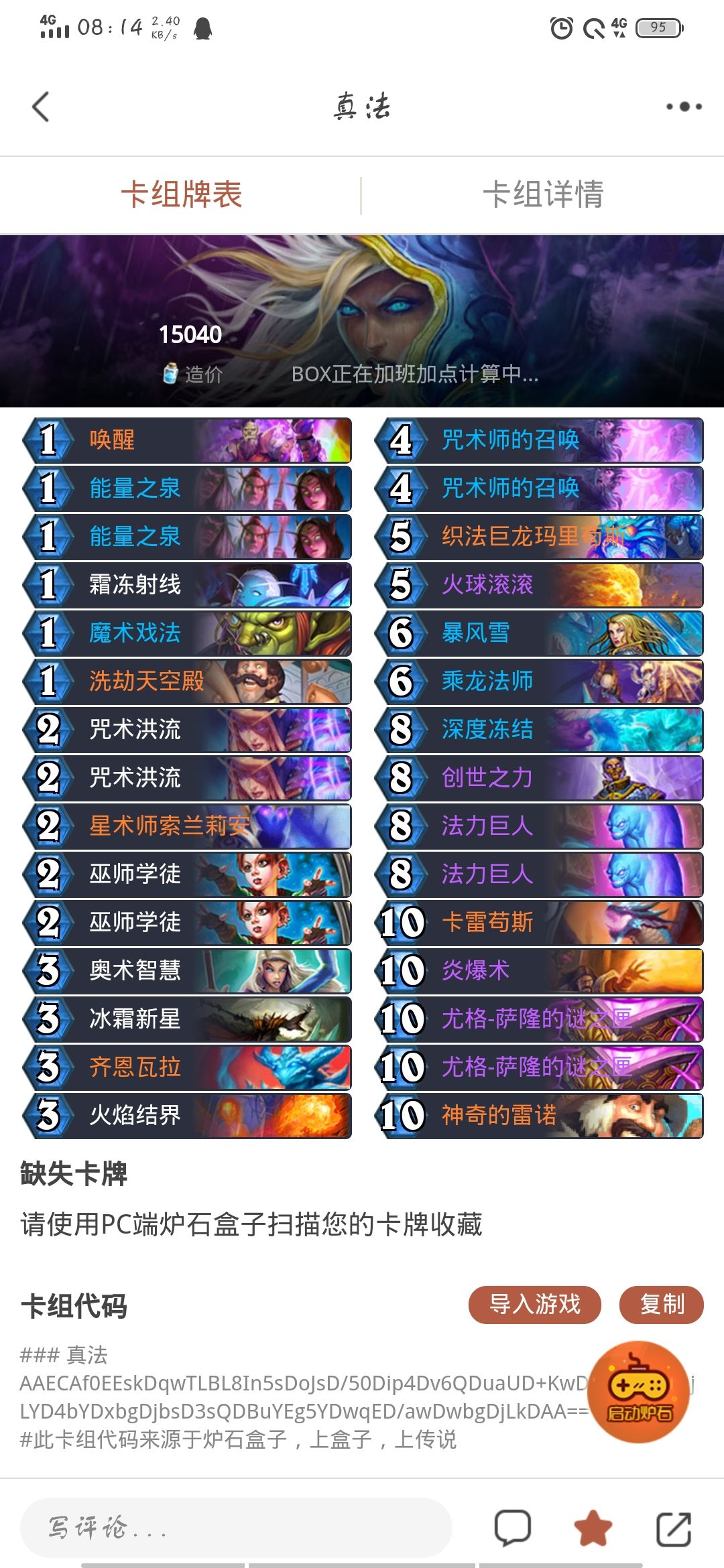 虽然是真法但是卡组并不排斥出现随从,可以随着环境灵活变动,并且随着扩展包的增加只会越来越强。(嘛,毕竟狂野的小姐妹要被砍了,不过吉安娜被削的事,这跟我玩标准的卡德加有什么关系)