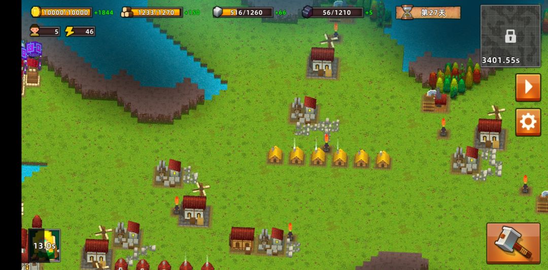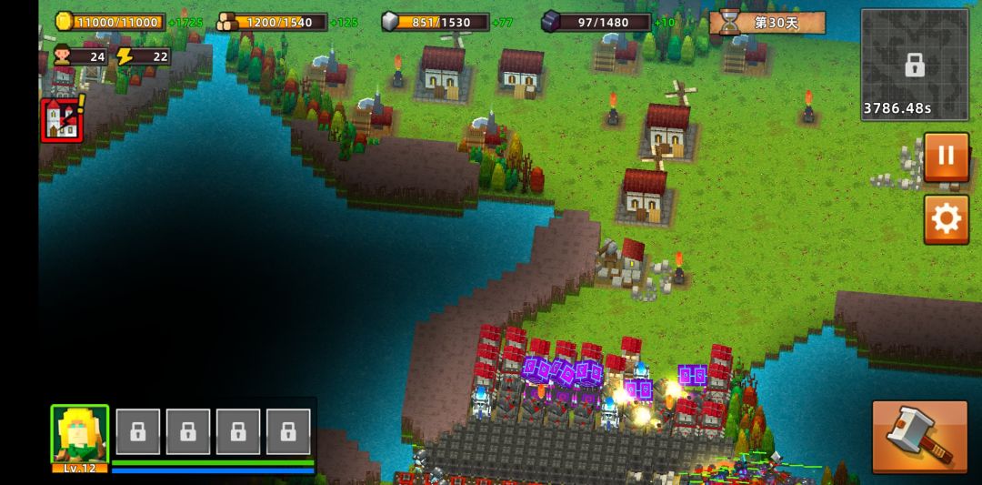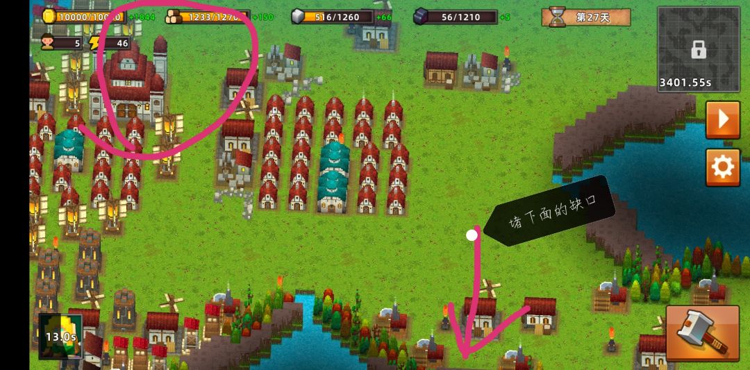 地图一种三个门,主城上面一个。右边往下走有两个门。前期堵两个缺口就可以了,离得也很久,几天就堵上了,然后发展起来很放心。上图