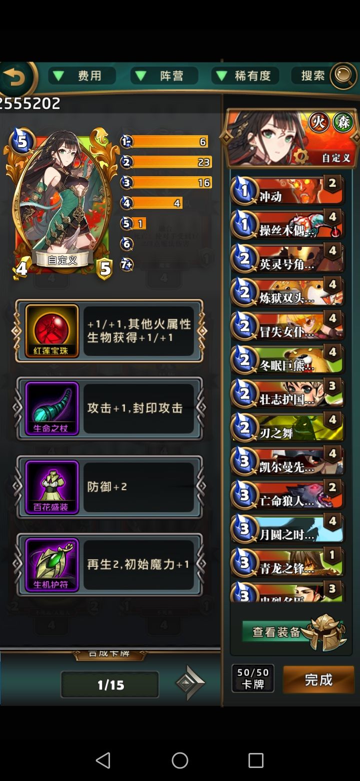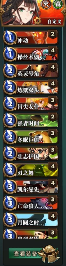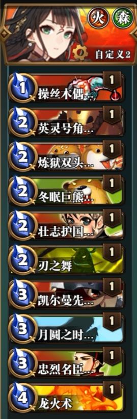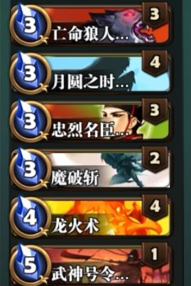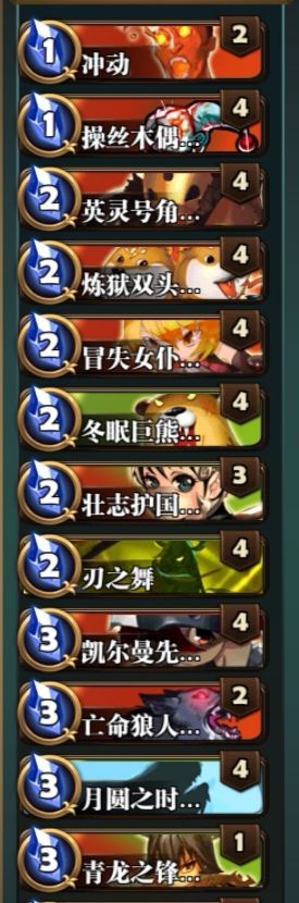 减少了熊和女仆,熊容易和前期抢血节奏冲突,女仆本身素质偏低,缺少buff的情况下前期略显乏力。龙火4费打4在这套牌里也算不得高效,考虑减少,可以替换成关羽专属卡斩,1费打4,或者满编狼人,又或者加入毁灭亲王,有待试验。