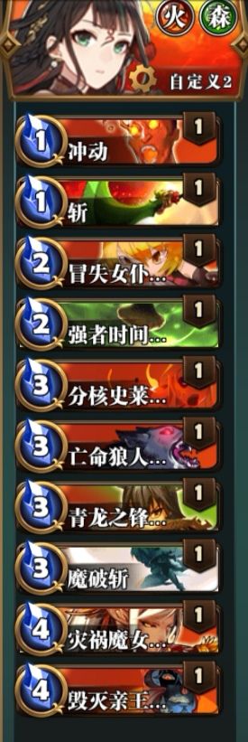 冲动的自残在关羽手里算不得负面效果。1费斩4,可以解场,对面空场时就会打脸,低费高效。冒失女仆,速攻里就她最不行,只有补速攻数量的时候用。强者时间比月圆之时低一费,只是少了魔免。如果觉得buff不够的话可以加上。分核史莱姆,很好玩的一张卡,养出的史莱姆宝宝吃到刃之舞后会变成满地的21,白给的输出。但是,还是有很大的卡场地风险,用前请三思!亡命狼人和双头犬类似,吃到buff打脸两次的话血赚。但需要击杀敌方生物才能触发,这就需要对手的一点配合了。不太稳定。
