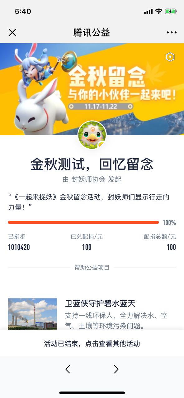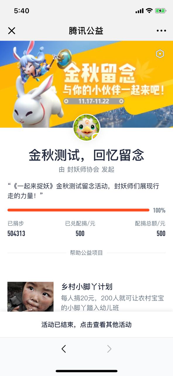 仅仅几天时间,封妖师就已捐赠了高达161万的步数,这份热情、这份爱心,足以体现本次金秋测试的火热程度。虽然游戏已经删档,相信封妖师们会持续关注游戏,期待《一起来捉妖》正式上线。《一起来捉妖》会以更好的姿态迎接各位封妖师的到来,我们不见不散!