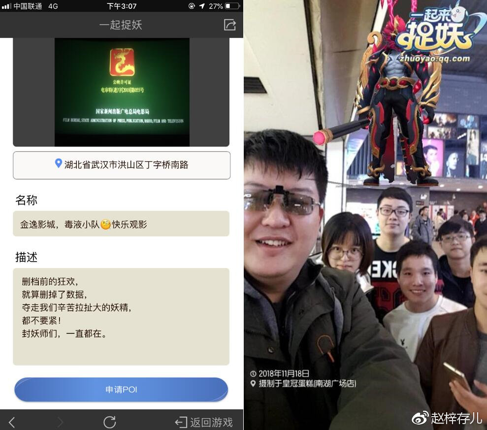 配文:边聊边走边敲鼓,买好了电影票,便直奔那个影城。一起和AR猴哥照相片,一起在影城吃着爆米花喝着快乐水,虽然我们没有超能力,但是我们也是有着特殊身份的人,我们是一群热爱游戏,热爱封妖,在那个世界里享受自己的选择和努力的封妖师。
