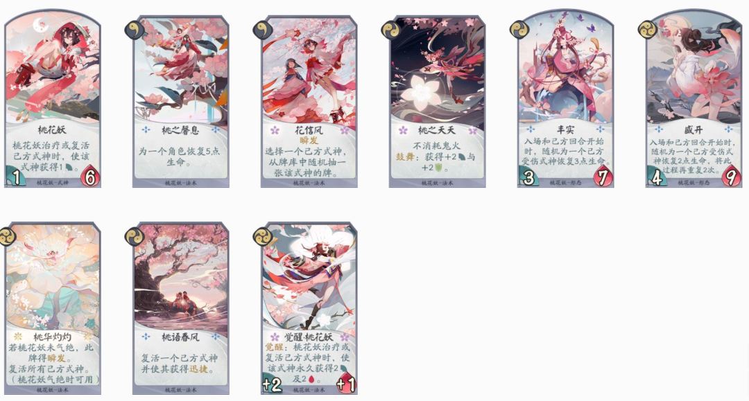 与其它不消耗鬼火的牌类似,桃之夭夭同样可以让你快速将手牌转化为场面,并且在一回合内打出高节奏。这张牌可以在恰当的时机帮助己方式神完成本不能完成的交换,但如果携带太多就容易出现手牌跟不上的情况了。