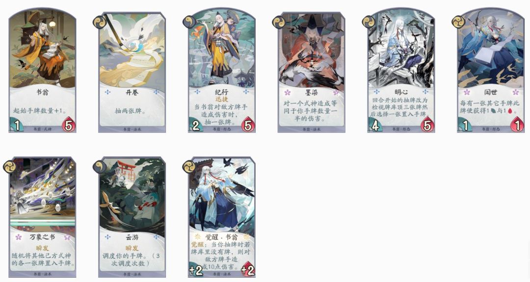 书翁是游戏当中唯一以过牌为核心的式神,除了给一些手牌消耗较快,或是手牌需求量大的控制卡组作为辅助外,书翁最重要的应用还是基于书翁觉醒牌的快速过牌流。鉴于书翁的觉醒牌由直接秒杀改为了每回合造成10点伤害,这套卡组现在需要更多的回合数才能击杀对手,而这多出来的一两个回合往往就是一场对局的胜负之差,也让这套牌的强度大大下降。另外,书翁的许多牌都没有任何场面节奏,这也导致了他很难在依靠场面的节奏卡组中作为补牌式神出现。因为上述的这些原因,书翁目前只能屈居T2,但这并不影响他游戏中独一无二的定位。