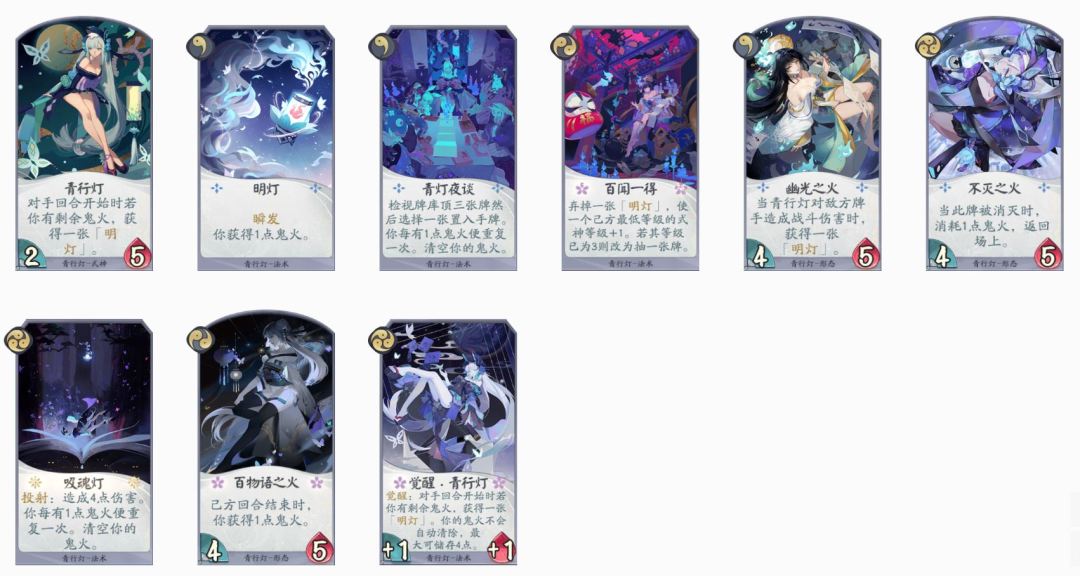 这张牌可以让青行灯在有鬼火预留的情况下无限复活——每回合打一张明灯即可形成循环。但是这张牌本身战斗力一般,导致其即使有无限复活的能力,面对身材比自己大一号的其他三勾式神,往往也难以上场战斗。如果用来在等combo牌的时候保证青行灯不死倒也可以,但是带这张牌是不是本身也降低了combo牌的上手率呢。