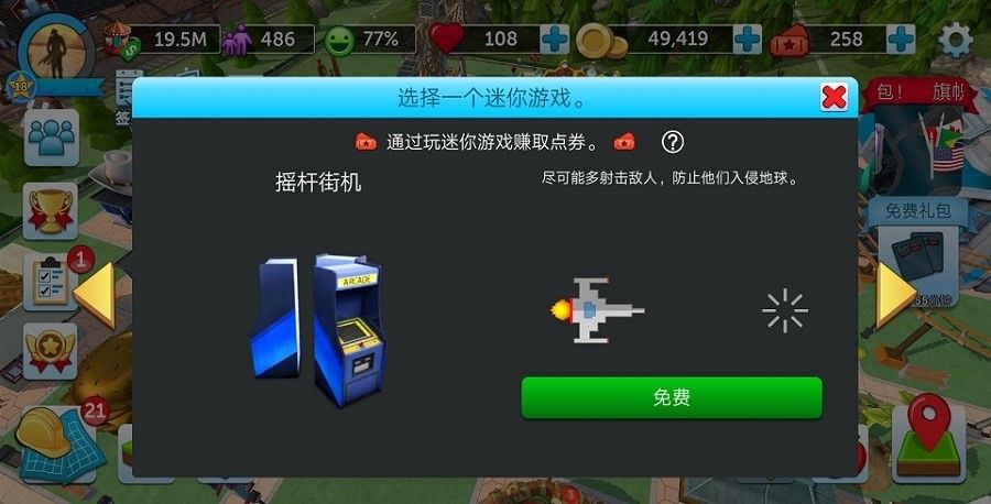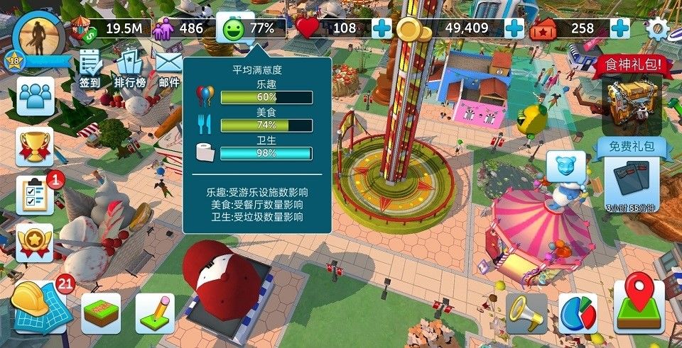游戏中,玩家需要提升美食、趣味和卫生各项标准,从而吸引游客游览提升人气,带来营业收入。在吸引游客的过程中,玩家还可以自由调整建筑的外观造型,调整设施票价,甚至体验各种趣味的小游戏。