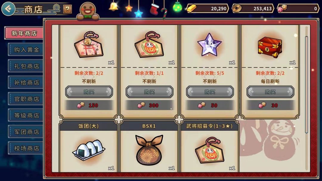活动内容:玩家在主线关卡中,有几率获得一定数量的新年道具“新年糖果”,道具可以在新年兑换商店兑换新年武将、SSR召唤券、饭团等奖励。