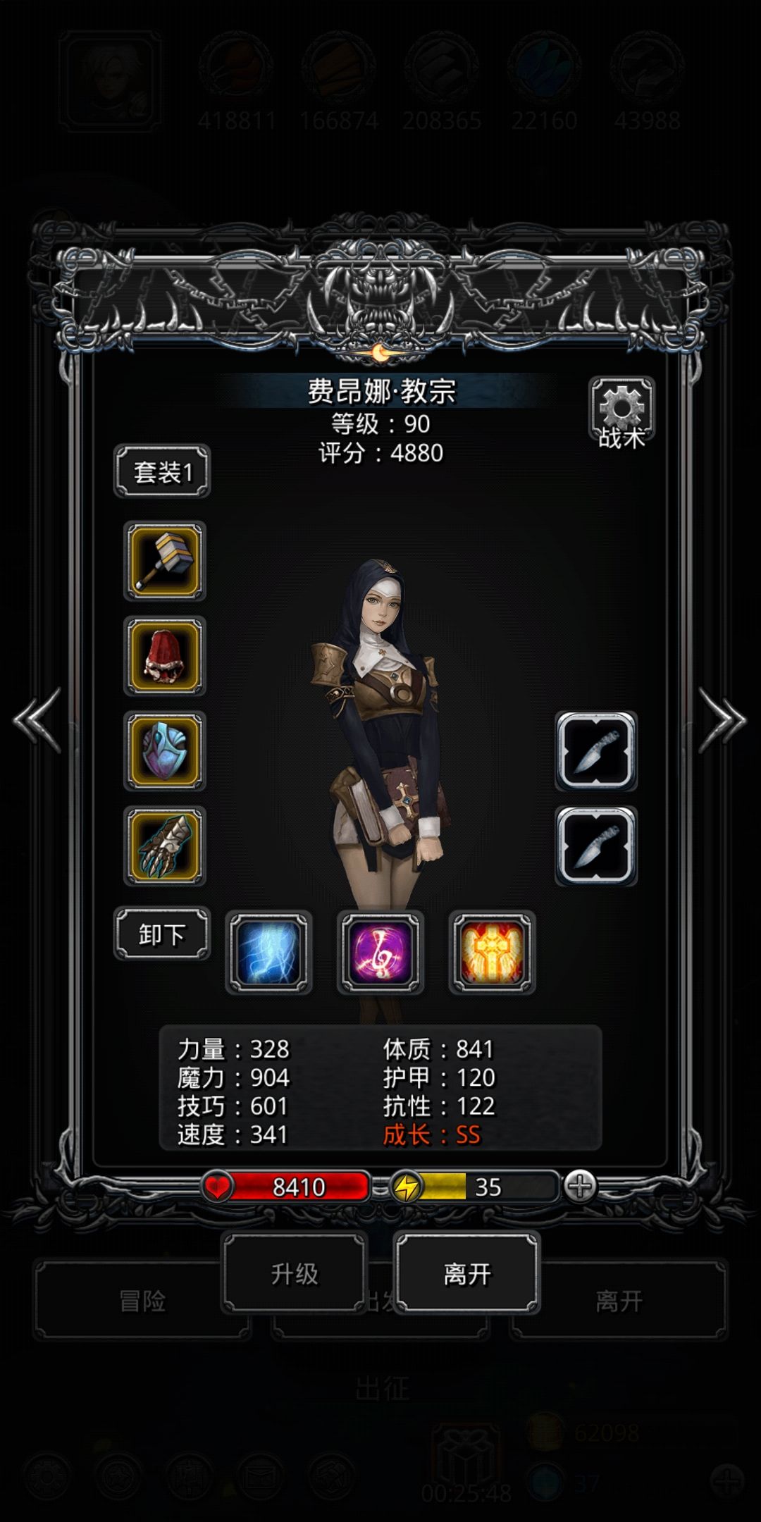 全力堆一些抗性,尽量拉平,祭司必带龙虾手套,多些技巧,boss魔法伤害减技巧,不带龙虾治疗没抗性,抗不住,输出位带龙虾可以保持命中,不想带可以不带,顶多打久些。