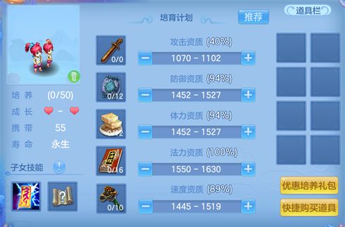 在满法资的前提下是最大限度地保证了速度、体力、防御的三围。这是个万金油的培养方法,孩子只需要花费铜币就可以洗点,这套培养方法是目前法师孩子较为通用的培养方式。