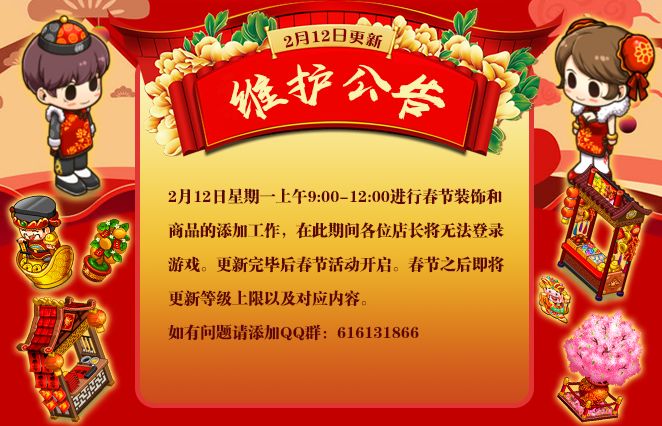 《我的便利店》于2月12日星期一上午9:00-12:00进行春节装饰和商品的添加工作,在此期间各位店长将无法登录游戏。更新完毕后春节活动开启。